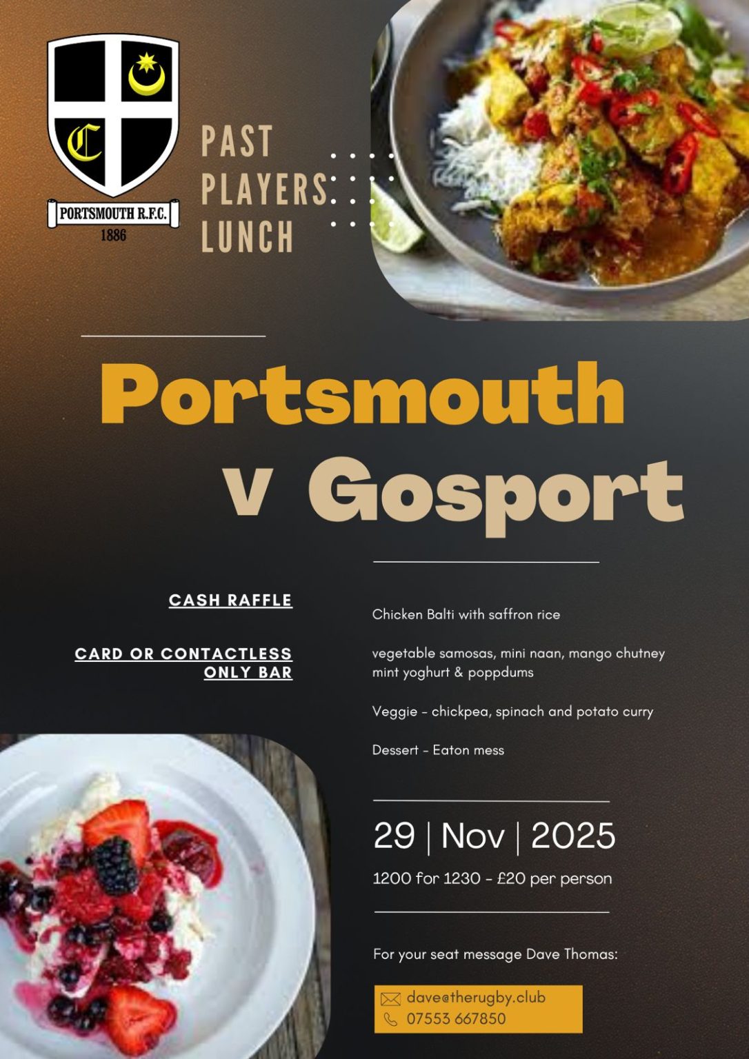 As ever, seats fill up quickly, so please book early to avoid missing out. Once again, let’s fill the clubhouse, raise a glass, and enjoy another great afternoon of food, friendship, and rugby.